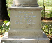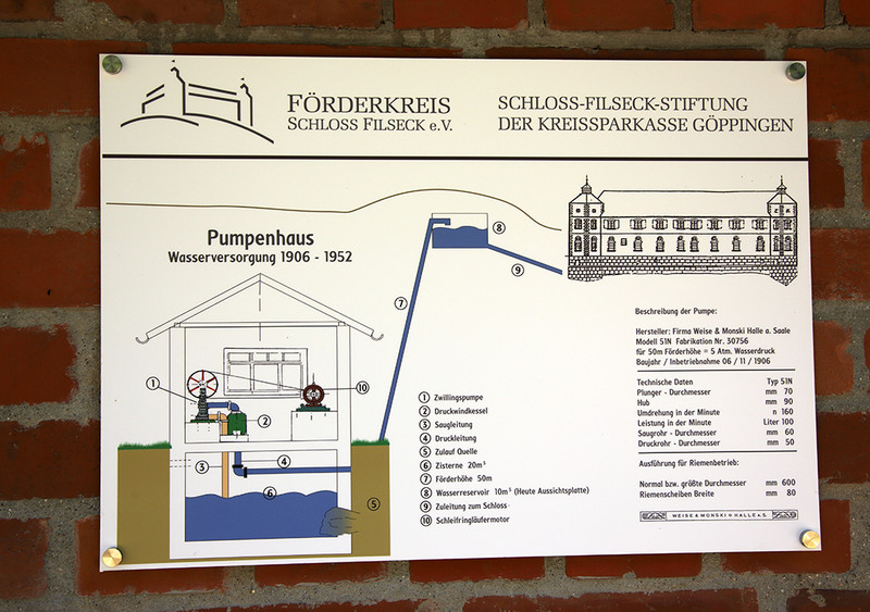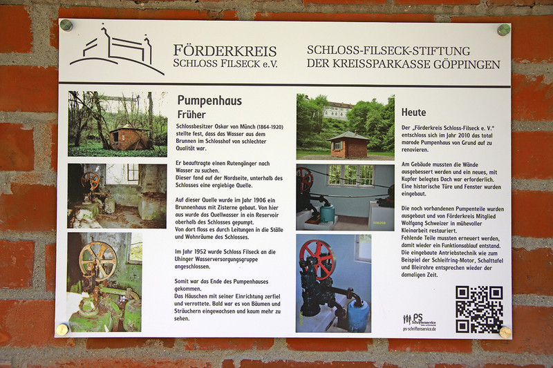 Oskar von Münch beauftragte einen Rutengänger, nach Wasser zu suchen. An der Stelle, wo dieses Brunnenhäuschen steht, wurde er fündig. Er entdeckte eine ergiebige Quelle und zwar dort, wo schon früher die Bewohner von Schloss Filseck Trinkwasser holten. Oskar von Münch baute dieses Brunnenhäuschen um 1900, stattete es mit einer starken Doppelkolbenpumpe aus, die von einem Elektromotor angetrieben wurde und das Wasser nach oben in einen Wasserhochbehälter pumpte. Auf diesem Wasserhochbehälter vor Schloss Filseck befindet sich heute eine Ruhebank und eine Bronze-Relieftafel, auf der man sich über die Berge der Schwäbischen Alb und die Umgebung von Schloss Filseck informieren kann.