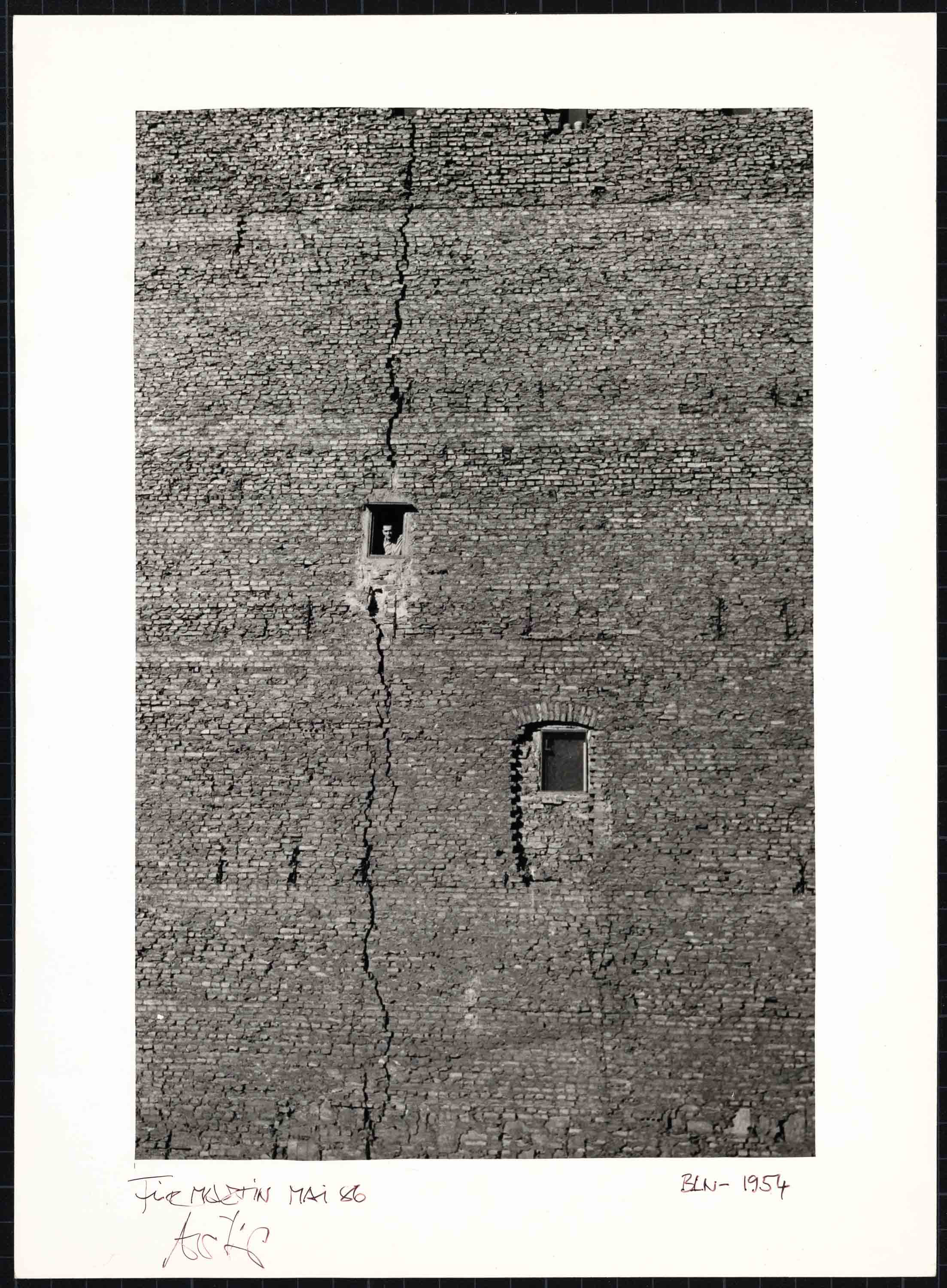 Abbildungen: Arno Fischer, West-Berlin, Riss in der Mauer, Silbergelantineabzug, 1953, Erbengemeinschaft Arno Fischer und Arno Fischer, Ost Berlin, Friedensfahrt, Prenzlauer Berg, Silbergelantineabzug, 1957, Loock Galerie
